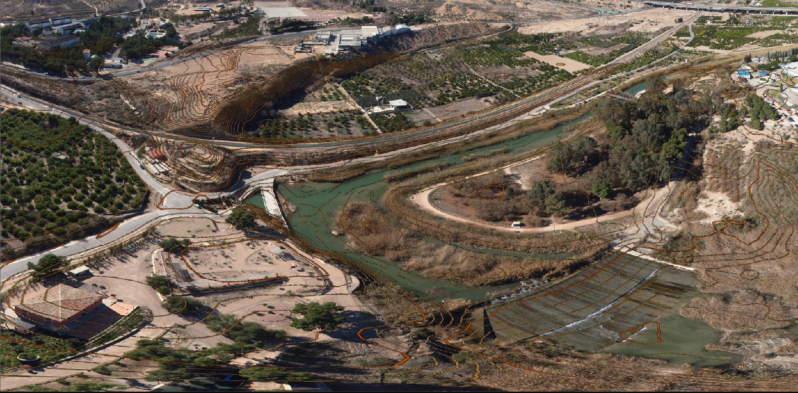En ella se integran Curvas de Nivel en imágenes aéreas obtenidas con el empleo de RPAS, obteniéndose un efecto informativo que pretende integrar IG procedente de otras fuentes, en este caso de la BCN editada por el IGN, con IG propia.